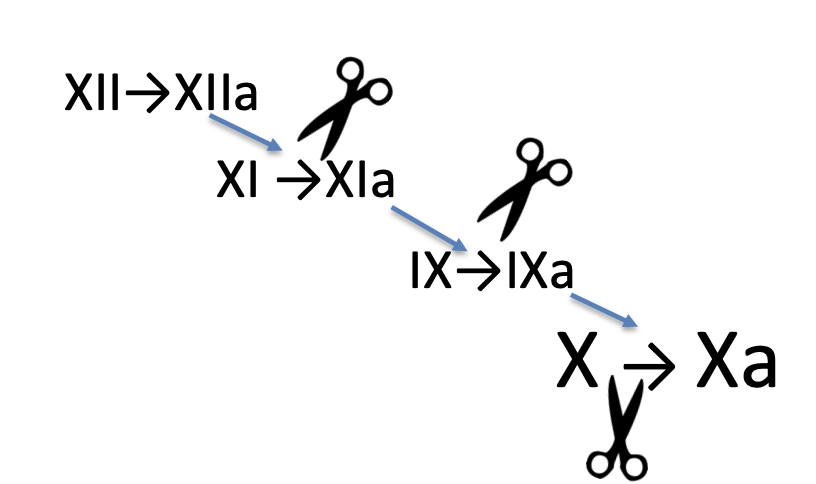 Factor 12 (XII) is cleaved into factor 12a (XIIa) Factor 12a cleaved factor 11 (XI) to 11a (XIa) Factor 11a cleaves factor 9 (IX) to 9a (IXa) Factor 9a finally cleaves Factor X to Factor Xa