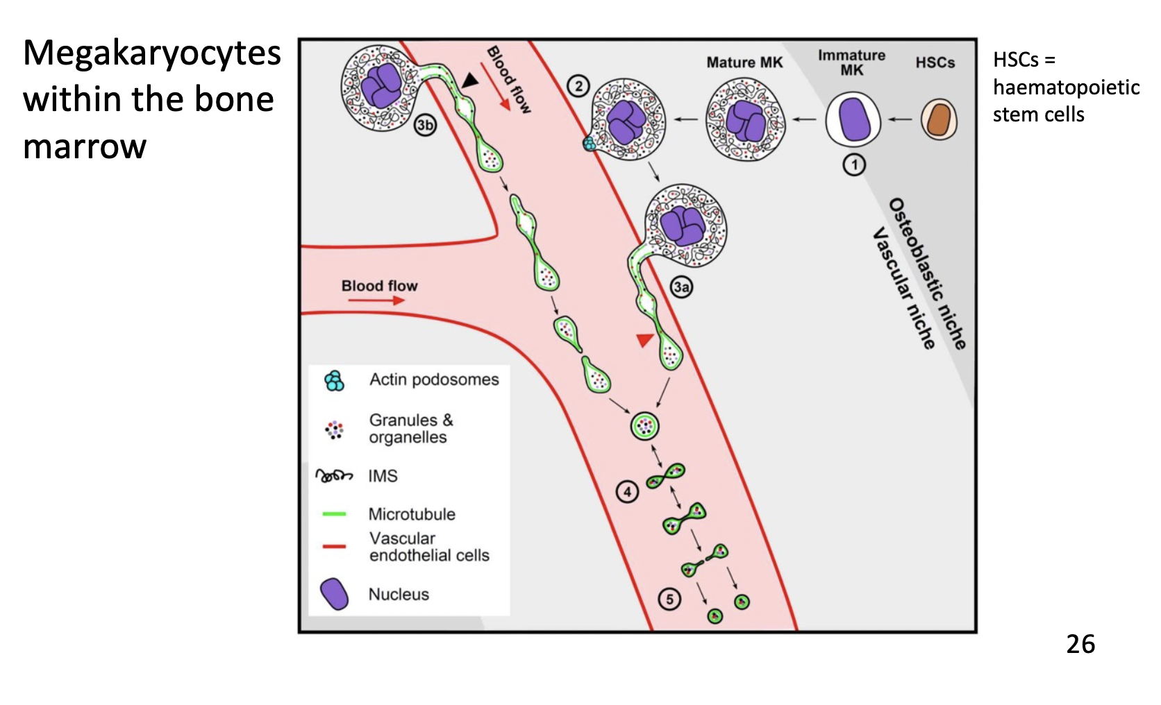 Platelets are produced from megakaryocytes. These cells “bud” their cytosol and plasma membrane off into the blood vessels almost akin to blowing bubbles into the breeze, which form proplatelets. These mature into full platelets. This process can be stimulated by thrombopoietin (TPO)