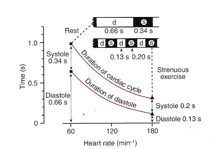 Most of the durations for cardiac cycles you are given in this assume 60bpm but the times dont change proportionally in increase of HR (and subsequent decrease in time per HR). as heart rate increases and time per beat decreases systole is for the most part maintained and diastole decreases. It is illustrated nicely in this diagram. you can see that while systole decreases diastole decreases more. This is able to happen because of the frank starling law, as your blood is pumping more when you exercise more blood is returned after, and your vein reduce the amount of blood held in capacitance