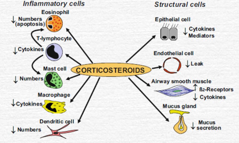 reduce recruitment inhibit macrophage function reduce vascular permability no effect on broncodilation but over time may decrease airways hyperresponsiveness