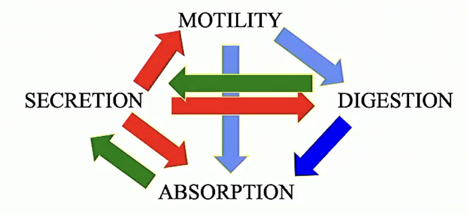 We need motility to move and crush food to smaller bits (digestion) and we also need motility to be able to push all the molecules up to the brush border to be absorbed as diffusion isnt great over long distances. We need secretion to digest everything molecularly, to make everything watery and slushey, and we need to secrete things to help absorption. we then need to absorb all the water and we secreted as well as we digest our secretions. We end up with a chart like this.