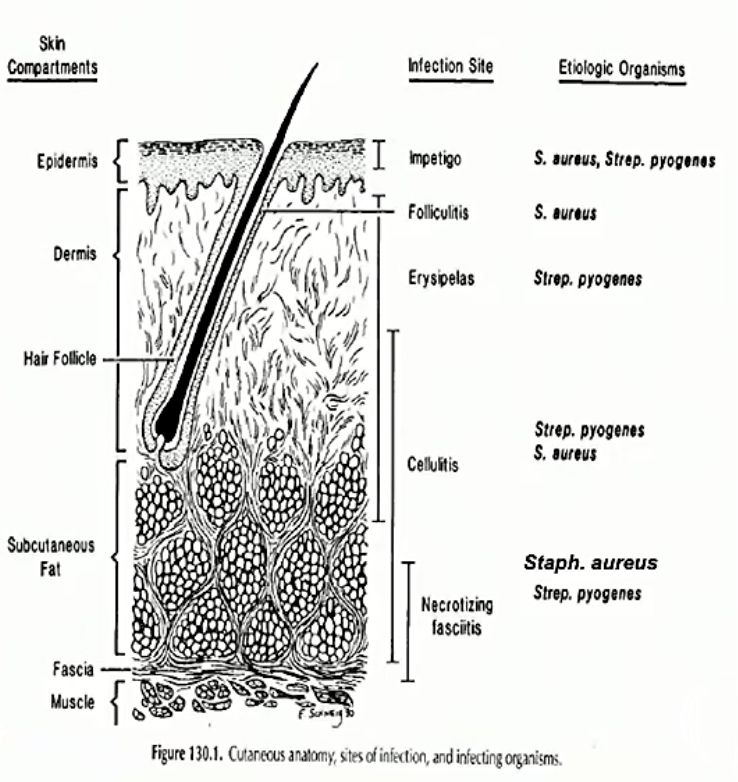 Skin infections are often caused by pyogenic gram-positive cocci, most common of these are Staphylococcus aureus and Streptococcus Pyogenes.
