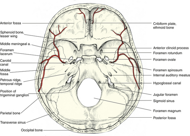 In the inferior region of the internal skull there are 3 pairs of “pools” called fossa, where the frontal lobes, temporal lobes and cerebullum sit. They are easily named the anterior middle and posterior fossa. There are many structures in the medial portion of the cranial floor where there are holes for entry and exit for cranial nerves, blood vessels, sinuses and a big one for the spinal cord.