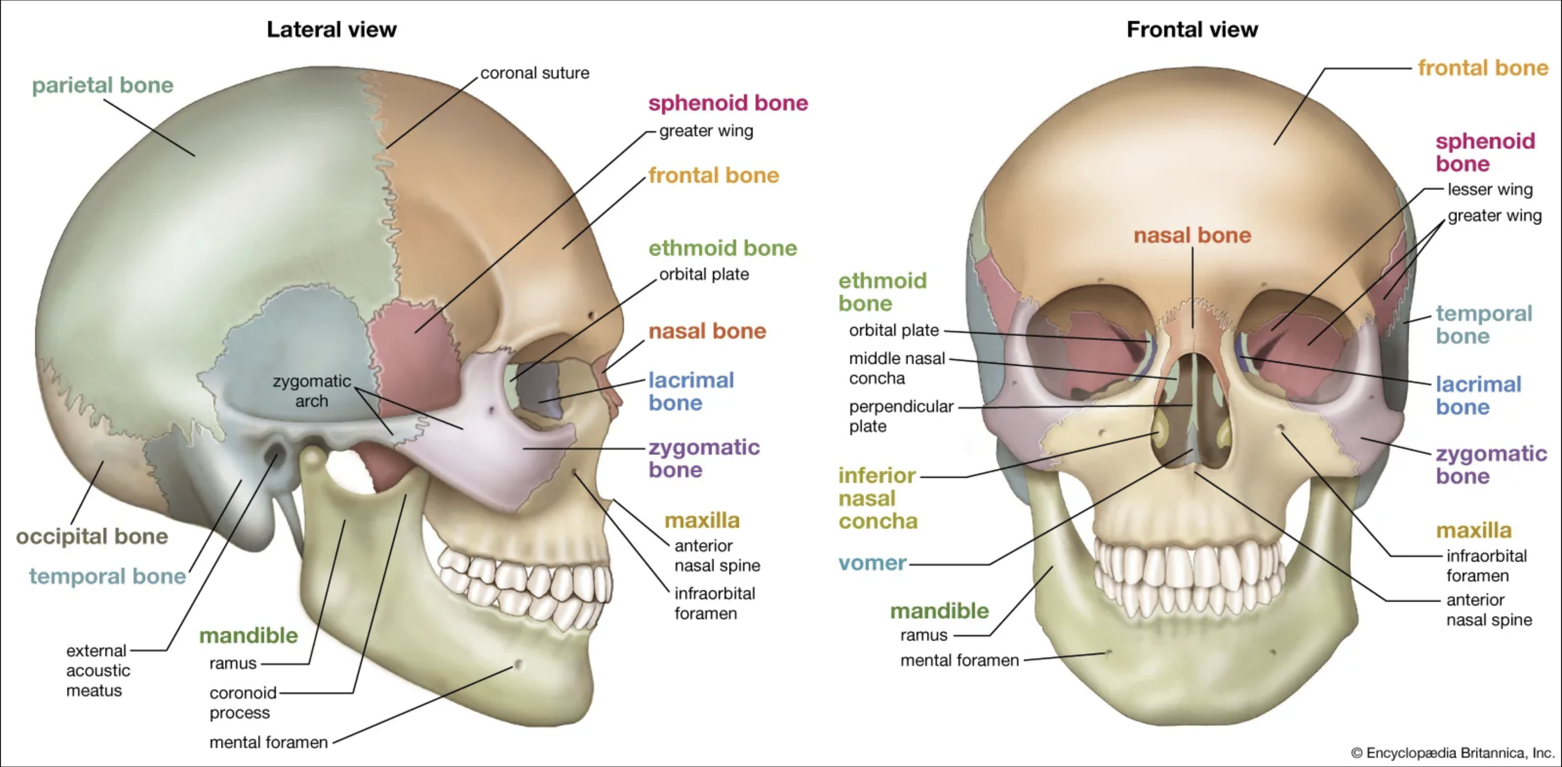 The Skeletal structure of the cranium is somewhat simple, with 8 bones that make up the cranium. This is relates back to respiratory in MED2 and is continued more.