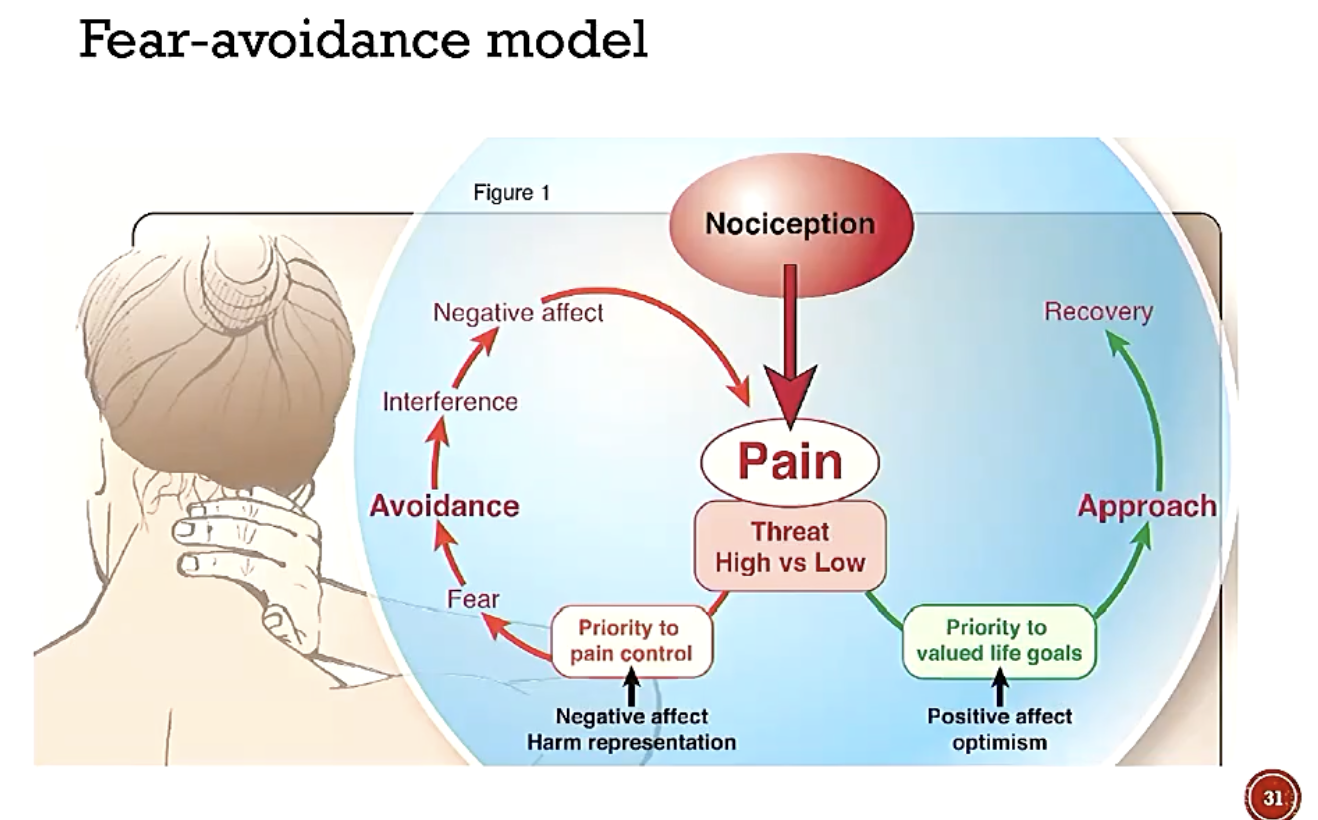 This is where you have a negative mindset about the pain (I’m going to hurt, I’m not going to get better, I cannot manage). This leads to high threat and you focus on the pain, your worry and your body. This leads to fear, and you are always thinking about the pain. You avoid activities that may help you or make you feel better, or push through and injure yourself more. It interferes with your life and as it does it negatively affects you, leading to further high threat thoughts