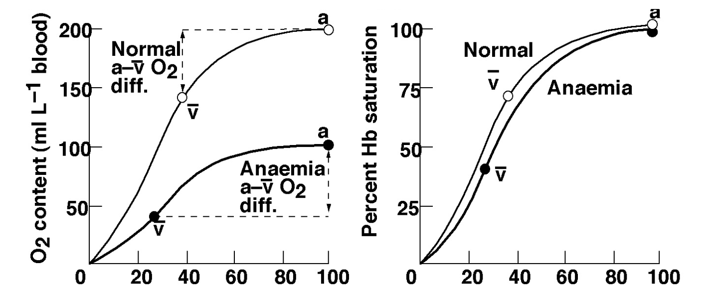 Anaemia reduced the amount of O2 carriers in the blood. subsequently the percent Hb saturation is unchanged, However the O2 concentration is. (lecture slides state exercise problems from a-v difference but i need to recheck) These graphs shows differences nicely (pay attention to Y-axises)