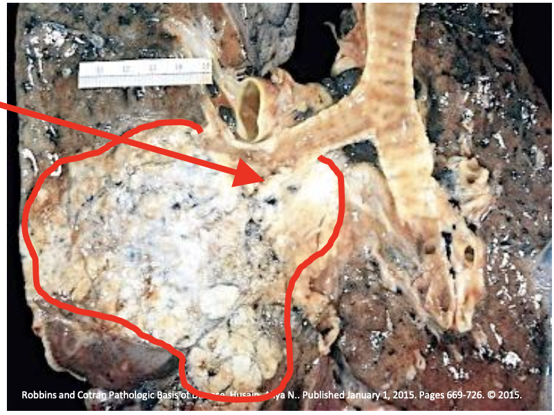 In the second picture you can see how the small cell carcinoma its clustered around the bronchial wall and (i cant see it personally) infiltrated the lymph nodes.