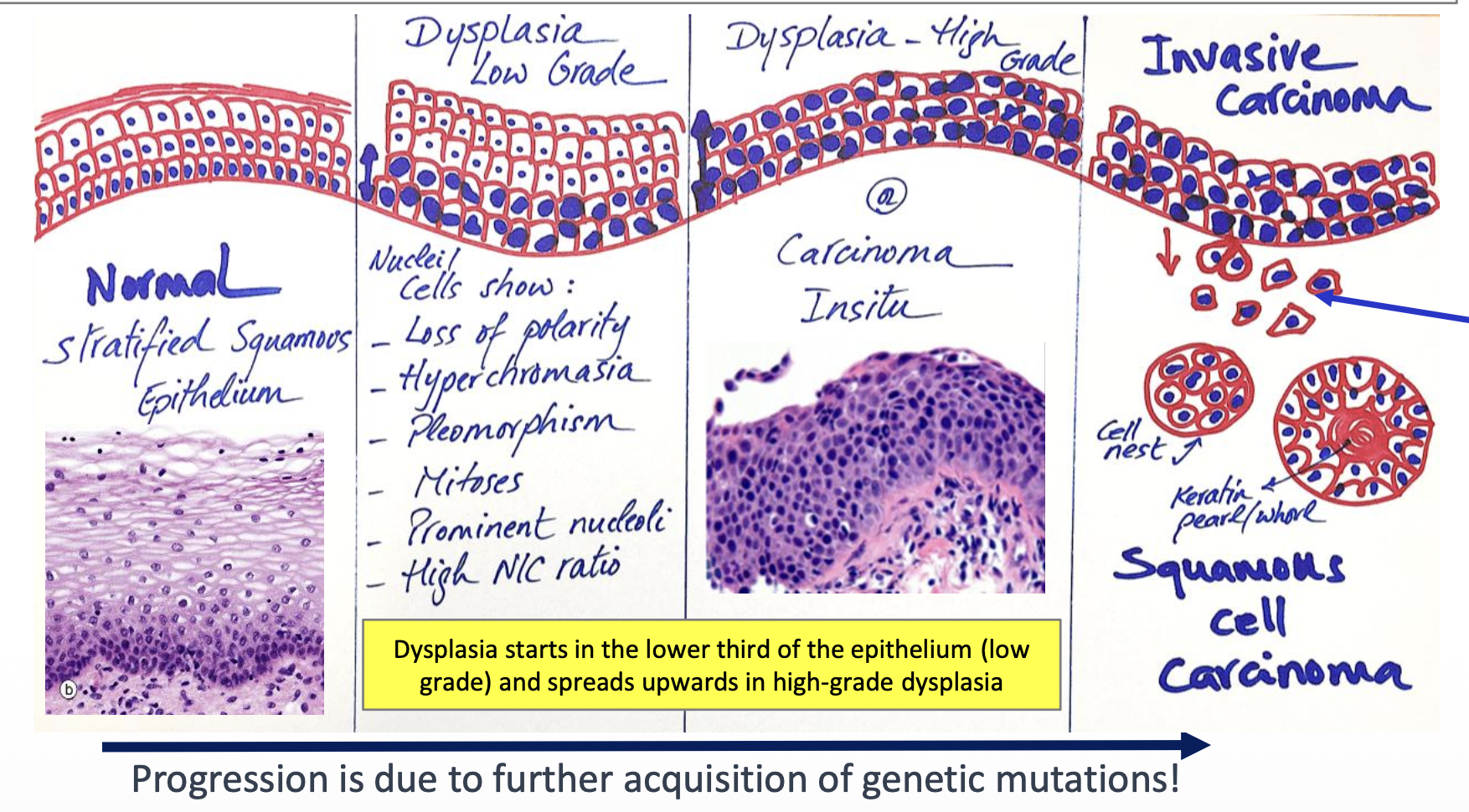 This is a shift of respiratory epithelium to squamous epithelium and then transformation. This is an example of hyperplasia → metaplasia → dysplasia (while dysplasia isnt cancer in itself it is a premalignant change)