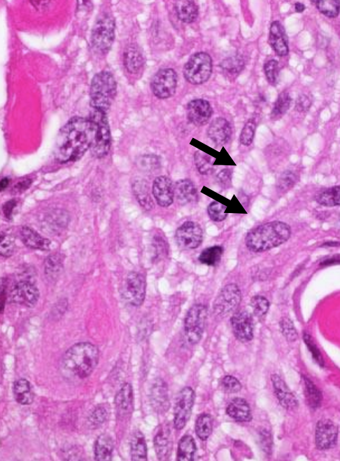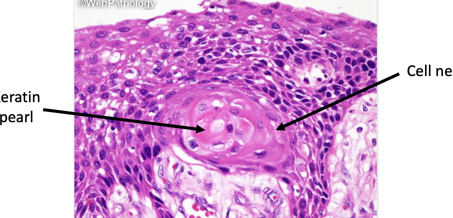 Additionally in well differentiated SCCs malignant tumour cells are arranged in groups called cell nests with central keratinization called keratin pearls or whorls