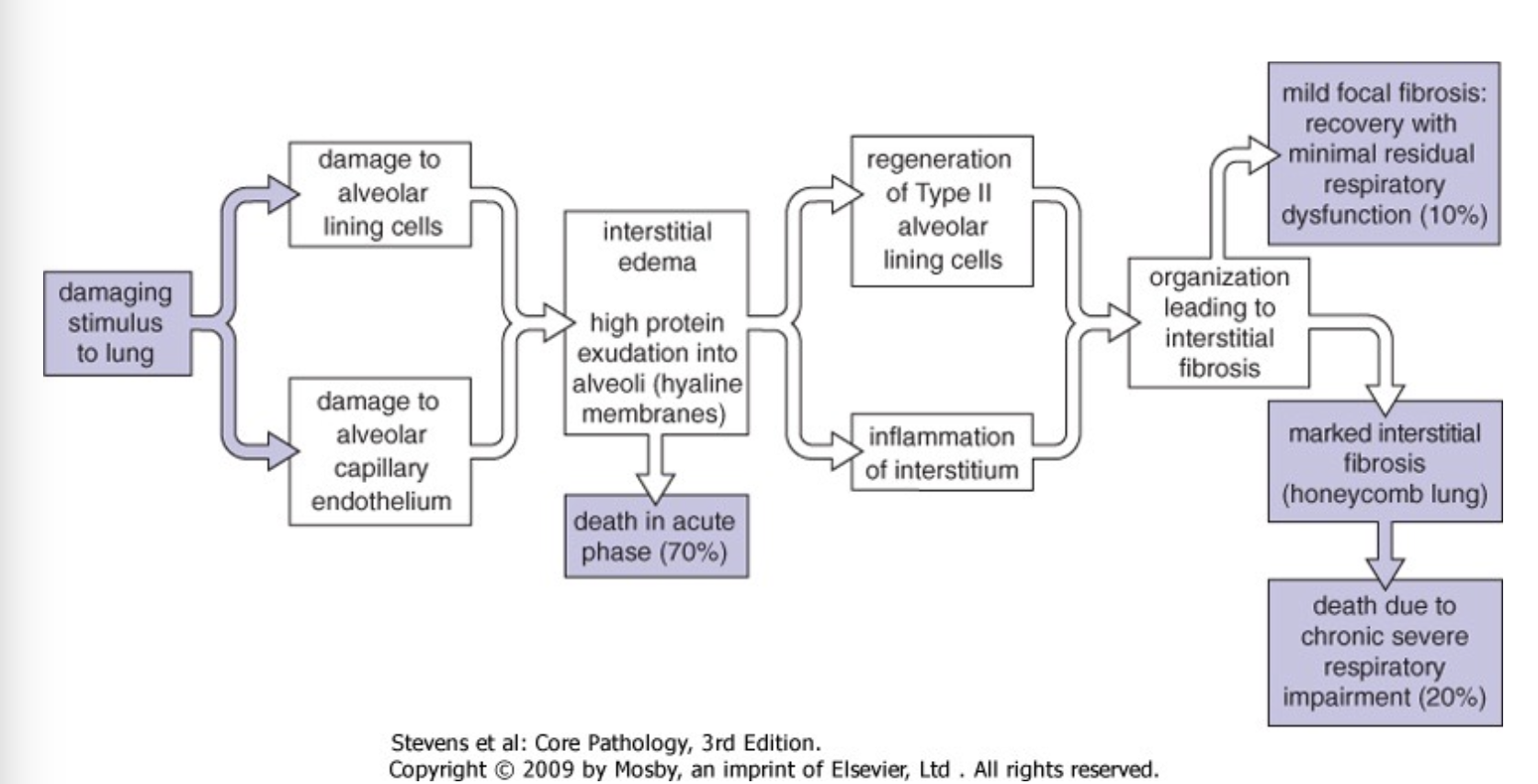 The Fibrotic phase consists of resolution with minimal fibrosis. Repair happens here often with thing alveolar wall resulting as well as progressive fibrosis?