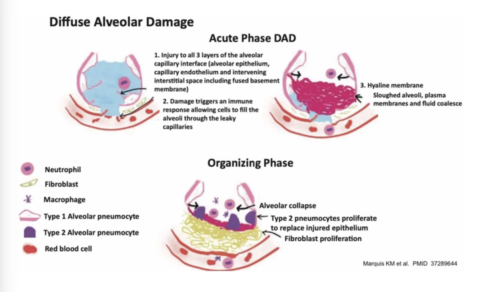 There are 2 phases to ARDS, the proliferative phase and the fibrotic phase. The proliferative phase lasts 1-3 weeks and is characterised by proliferation of type II pneumocytes and macrophages invade and remove cell debris.