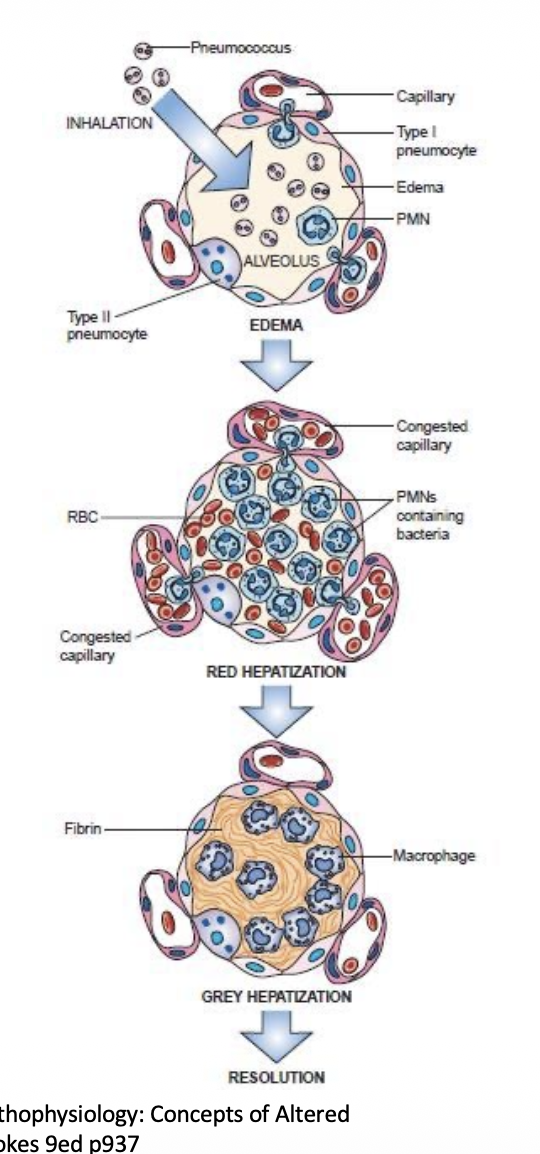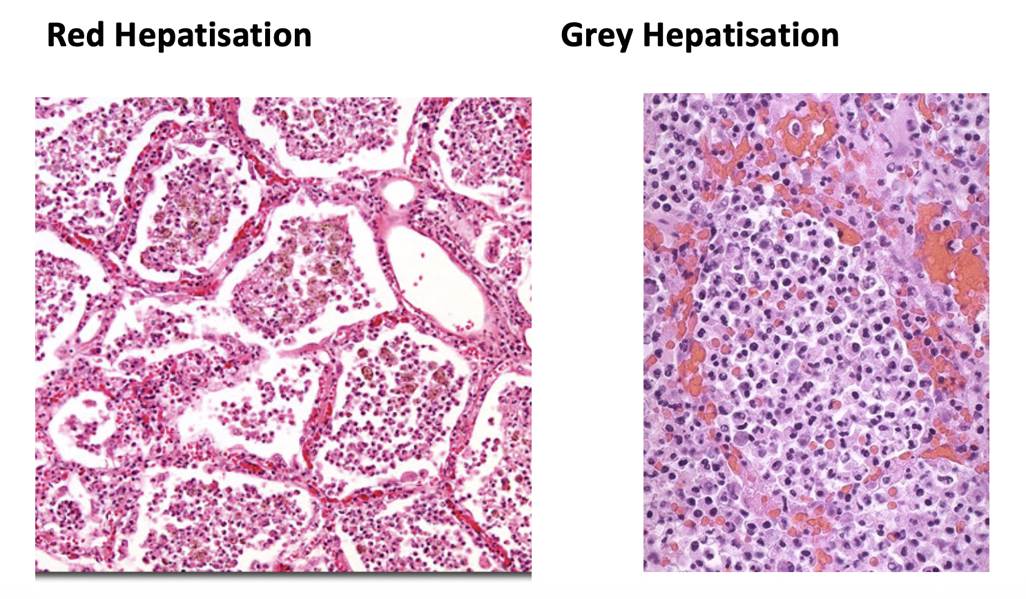 These stages are congestion, red hepatisation grey hepatisation and resolution. All of these are visually different and help with identifying what is going on with the lungs.