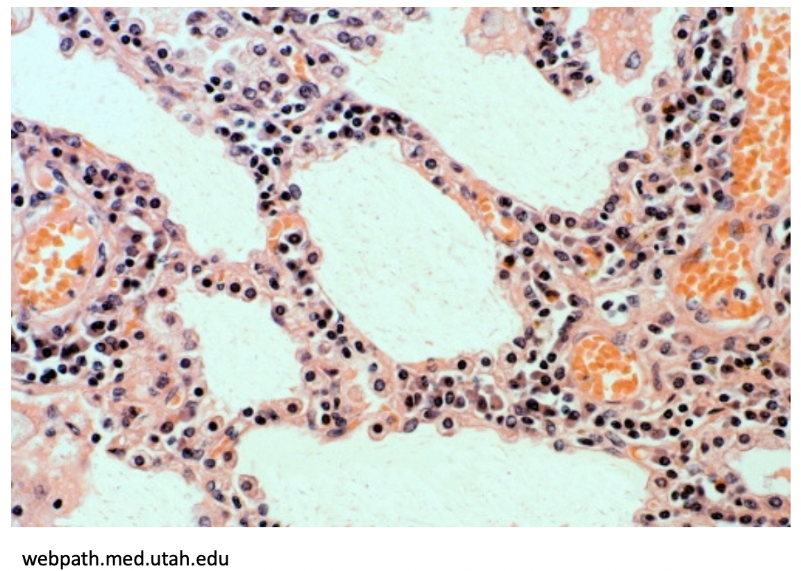 This is where the red cells enter the alveolus (bleeding into the lung). Neutrophils also enter the lungs and ingest bacteria,